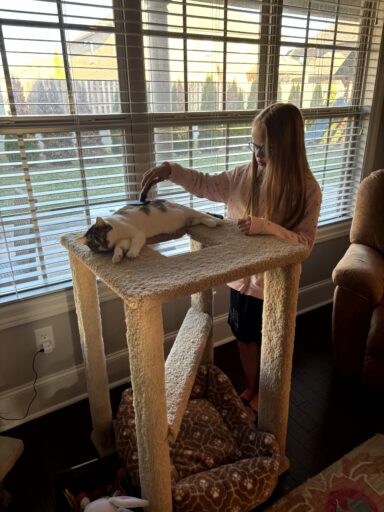 On April 12th, it worked out nicely that our soccer games didn’t start until later in the morning because it gave Paw and Rae Rae time to meet the kittens first. They had never met Willow and Cassie! The kittens weren’t in a very cuddly mood…they were more interested in playing and checking things out 😉 Brooklyn and Savannah played first at 11:30 am at Palmer 10. The girls knew several players on the other team today, including Brooklyn’s friend Zoey from school. The team they were playing today was probably the best one they’ve played so far this season. The Dragons got out to a 3-0 lead before the other team almost came back to tie it. The Dragons won 3-2. Brooklyn scored a goal in the 2nd quarter when she was playing forward. She kicked it in with her left foot again…it was a nice shot! Savannah scored the team’s 3rd goal in the 3rd quarter! She is definitely fitting right in and is an asset to the team. Both girls sat out in the 4th quarter, which worked out nicely because Travis and Abigail had to leave to get to her game at 1 pm at Dublin 4.