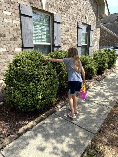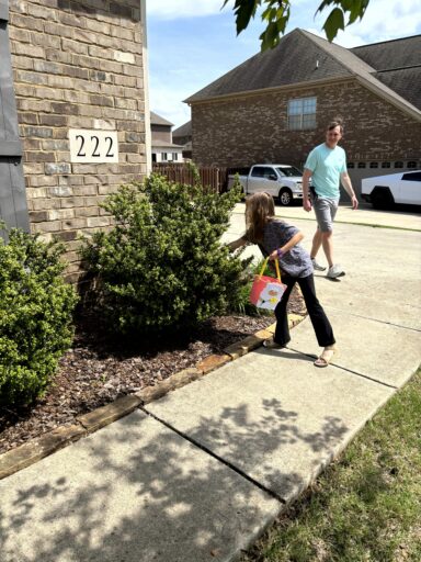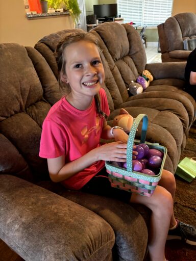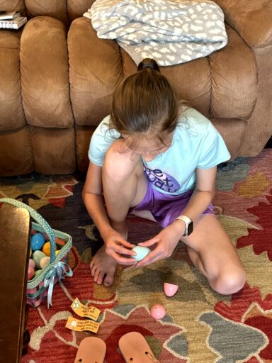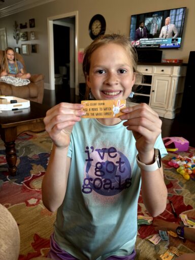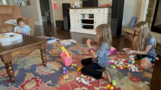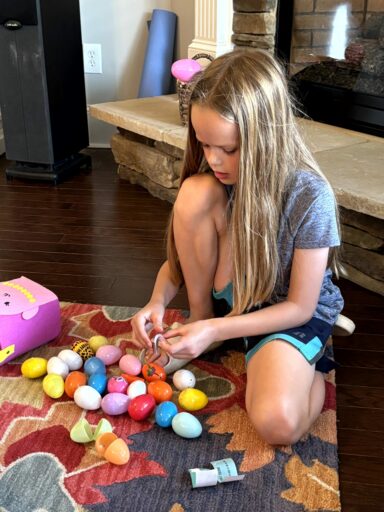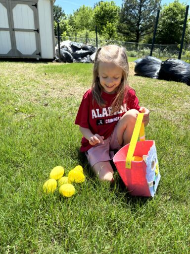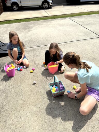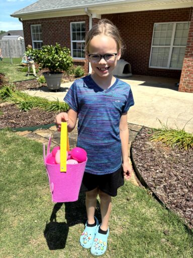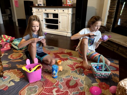 Normally, we eat lunch at Cici’s and have an egg hunt afterward with the cousins on Easter, but with Savannah being sick, we had to postpone that to the following weekend. We did still have an egg hunt at home though! I decided to put “coupons” in the eggs instead of candy this time, and the girls were excited once they discovered that!