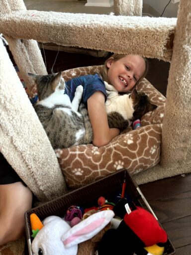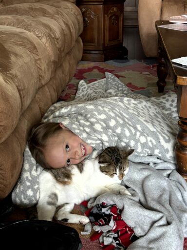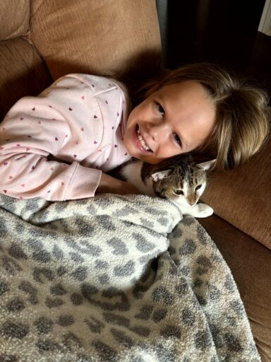 Savannah came home sick from school on Tuesday, April 15th, running a fever. She stayed home Wednesday but seemed better, so she went back to school Thursday and Friday before coming home sick again with another fever Friday afternoon. Kitten snuggles helped her feel a little better, at least :)