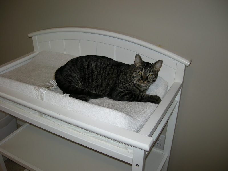 The cats are loving the new “nursery”. It qualifies as a nursery because it has a changing table in it, right? Haha…I guess we’ll get it done by February. Turns out that a changing table makes the perfect kitty bed. Felix and Gabby think we bought it just for them! Look who I caught up there the other day…