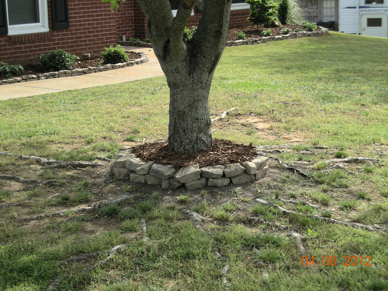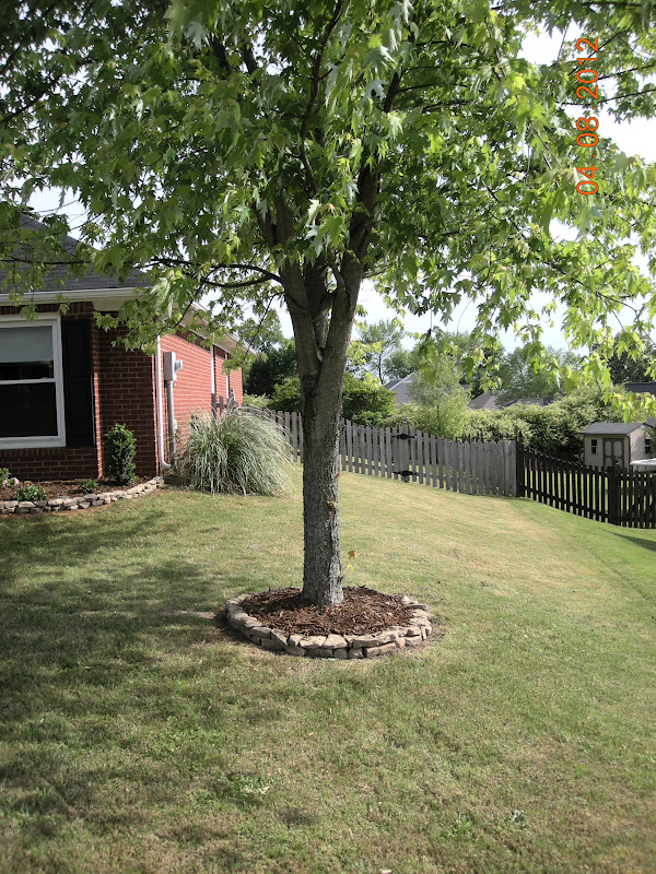| Big maple tree with fresh mulch and new rocks! |