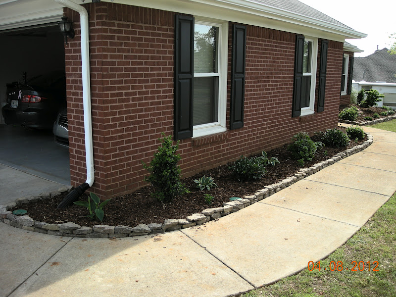 As of Sunday afternoon at 4:35 PM, Travis and I finally finished our landscaping project!!!!! We are SO GLAD to be through. As with most all of our projects, this one turned into something bigger than we ever anticipated…both in how much money it cost and how much time we spent on it. I just hope it will be worth the effort. I know how much money we spent on the project, but there’s no telling how many hours we spent researching plants, going to nurseries, digging holes, breaking up huge chunks of red clay, moving drainage pipes, lining rocks along the flower beds, planting flowers and shrubs, and mulching. It has definitely consumed most of our free time since mid-February.