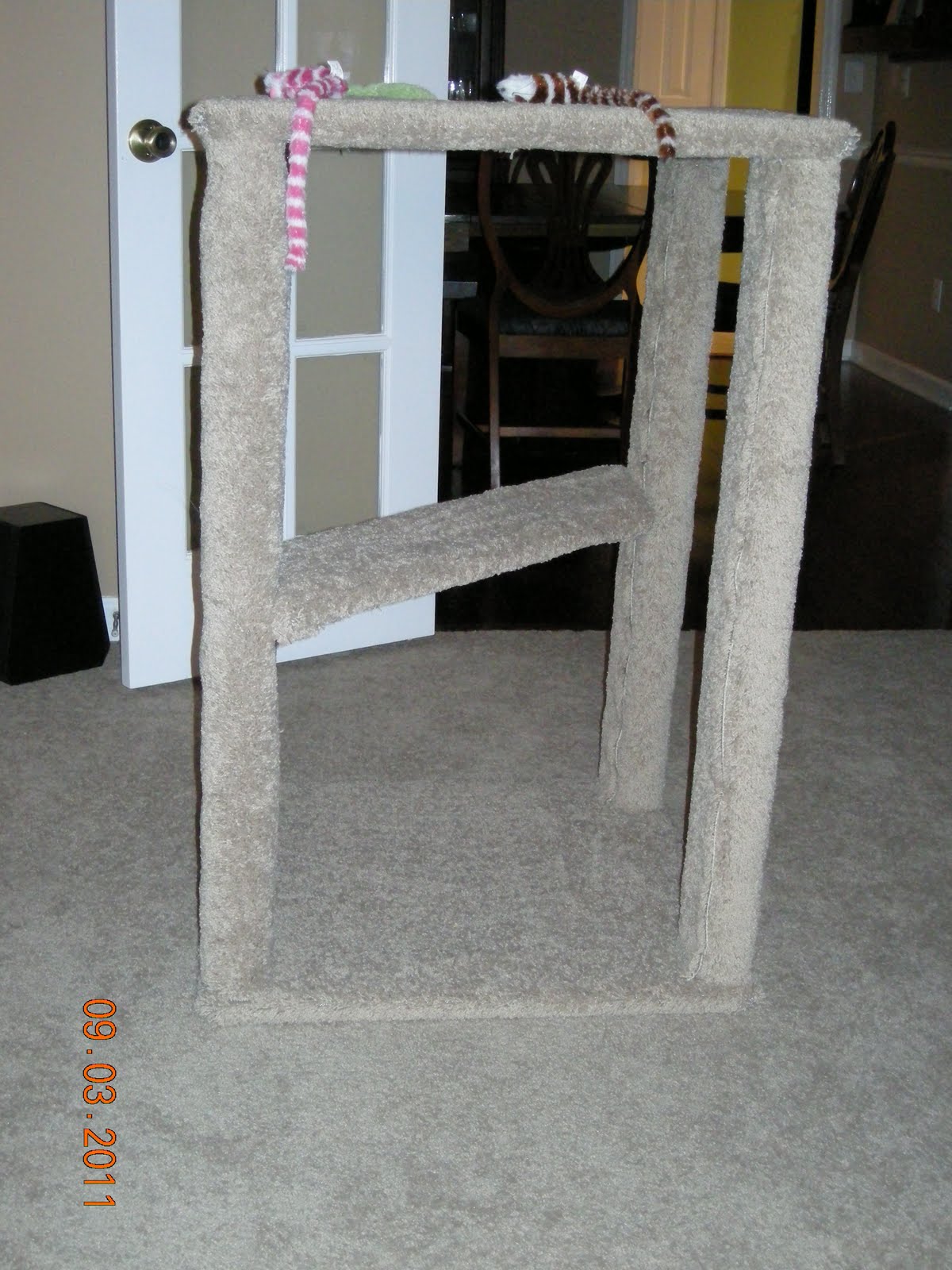 Felix and Gabby are adjusting pretty well to us and our house. I can already tell they are fattening up, which is good! They were pretty bony when we got them a week and a half ago. They love the Purina Kitten Chow I’ve been feeding them! They love to play with their toys, especially the toy mice with long fuzzy tails and their yellow tennis balls. They also love to wrestle each other. Gabby usually wins! She’s definitely the dominant kitty. Gabby almost always purrs when we walk into the room, and she’s started following us all over the house. Last night, she jumped on the bed and climbed all over me until I started petting her. She’s very sweet and friendly, and she loves to be petted and sit in my lap. Felix isn’t warming up as quickly, but I think it will just take some time. He loves to be near Gabby and loves playing with her and chasing her. He just doesn’t like to be petted or held very often. He’s pretty adventurous too though! The other night I caught him in our closet sitting on top on Travis’s hanging T-shirts…not sure how he was balancing up there! Felix and Gabby went to Trussville with us this past weekend, and they actually did very well on the car ride there and back. Felix was pretty scared on the way there for a little while, but eventually he cuddled up with Gabby and slept most of the way. They enjoyed playing on Callie’s scratching post/cat house while they were there, although I don’t know how Callie felt about that! Dad built them their very own deluxe scratching post though, and they have been having a big time with that since we got back home Saturday night. We’ve been letting them out of the bathroom a lot more since my last post, and we’ve even started leaving them out while we’re gone. They haven’t managed to destroy anything yet (that I know of), so I guess that’s good! :)