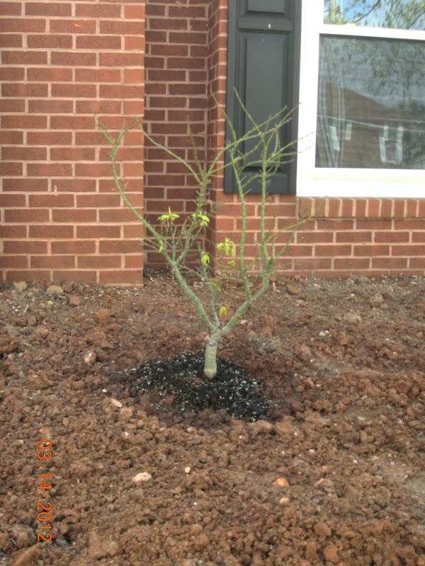 We were hoping to be able to get everything from either Reseda or Bennett’s (to save us some driving), but, of course, we ended up picking stuff that either one or the other place didn’t have. So, first thing Saturday morning, we headed back to both nurseries to pick out and buy our shrubs! It ended up taking all morning to do that…just because we wanted to look at everything one more time and get some last-minute opinions on a few things from the people there. We ended up buying 12 things between the two places! We got home a little after 12 PM, ate lunch, and headed outside to get started planting.
