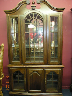 My big exciting find this week was a china cabinet! I wasn’t dead set on buying one this soon, but I found one at Encore Furniture Saturday night that I really liked. It’s not new, but it’s new to me, and it’s in pretty good shape. Here’s a (bad-quality) picture of it in the store: