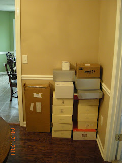 Well, we really haven’t made much progress on unpacking since my last post. We got the TV/entertainment center set up on Friday night–which is a several hour project b/c of the surround sound and all the cables–but other than that, things look about the same around here. Travis has been slowly getting his study organized, but it’s still got a way to go.