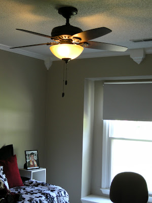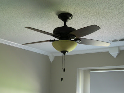 Last Wednesday, we had some excitement before supper. Travis got home from work and went into his study, flipped the light on, and it made a really loud popping sound, and smoke started pouring out!!!! Pretty scary! He took it down after church, and being a typical engineer, he took it apart and discovered that the wiring in the light was disintegrating! Not good. The good thing is that we both hated that light anyway…it was an ugly fixture with brassy gold trim. Besides just being plain ugly, it put out horrible shadows when the light was on. So, we were planning to replace it eventually anyway…this just sped up our timeline. We decided to look for a ceiling fan instead of just a regular light fixture. So, last weekend we “did our research” and went to Lowe’s and Home Depot to check out their selection. We eventually settled on one at Home Depot that we both really liked. We bought two so that the study and guest bedroom would match.