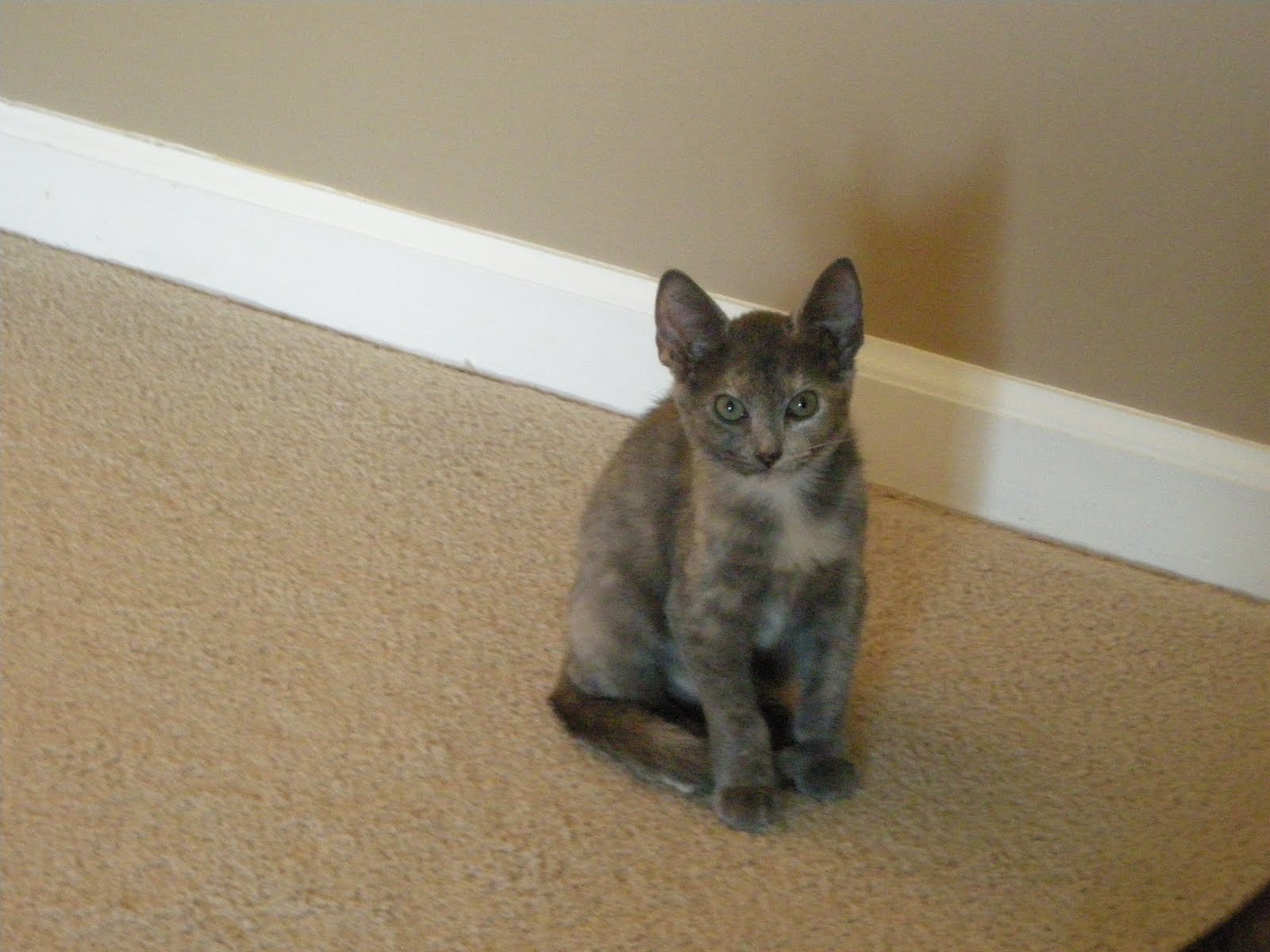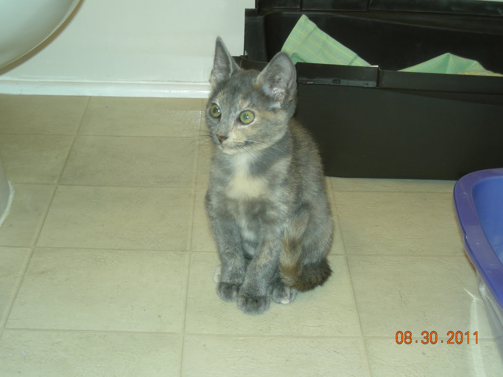 So, I had been looking on Craigslist and Petfinder for weeks/months trying to find the perfect pet for us. I went to Governors Choice Animal Hospital (not too far from where I work) to look at their kittens last week. They had 3 cuties!! Travis went to see them with me on Friday and he liked one of them pretty well, but we didn’t want to get her on a spur of the moment decision. So, Saturday morning we went to Pet Depot in Madison where MARF does their weekly adoptions every Saturday. Basically, all of their pets are in “foster” homes, and the foster parents bring their pets to Pet Depot every Saturday hoping that some will be adopted. When we got there on Saturday, I immediately fell in love with a beautiful calico named Mary Ann. She was about 9 months old, and she was so sweet and pretty. She had a rough life before she was rescued, and it just broke my heart to hear about what she’d been through. The picture doesn’t do her justice…she is so pretty! But, Travis really wanted to get a kitten “if we had to get a cat”, so we kept looking. Eventually, a lady brought in a whole bunch of gray kittens that had just recently been found behind the library in Madison. They’d been to the vet to get fixed and get their shots, and she’d only had them for 2 days. Travis immediately took to a couple of them, and after holding them for a while and trying to decide, we ended up taking two of them home!! We weren’t planning to come home with more than one, but we decided that it would be good for them to have a friend to play with when we’re not around.