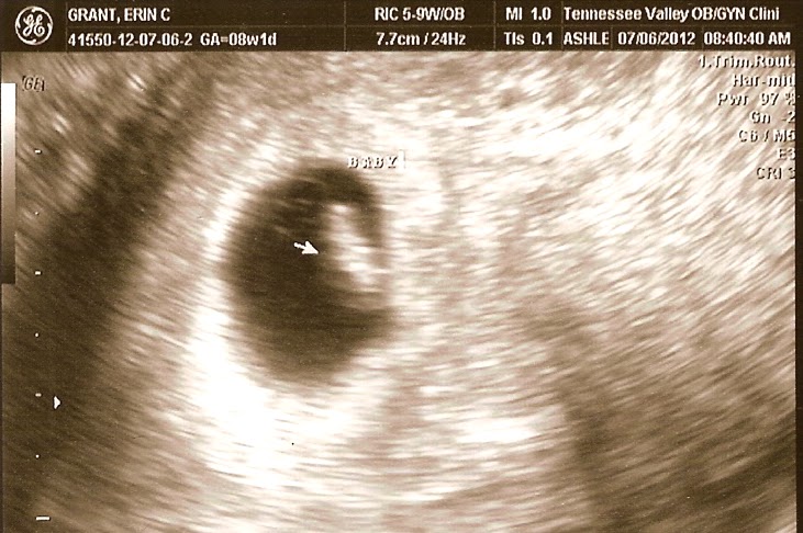 The Waiting Game: We were both really excited, but we wanted to keep the news to ourselves until we went to the doctor and made sure that I really was pregnant and everything was going well. So, other than one friend at work, we kept the news to ourselves for several weeks. I called and made our first OB appointment, and we went on July 6th. It was hard to wait that long without knowing anything or telling anyone!! Our first appointment went great. The first thing they did was an ultrasound, and after looking around for a second, the tech said, “I see a baby and a heartbeat.” That was an awesome feeling. We could see the little heartbeat…it was just like a flutter almost. Really cool! She said I was measuring 7 weeks and 1 day. The baby was 0.9 centimeters…..not even 1 centimeter long!!