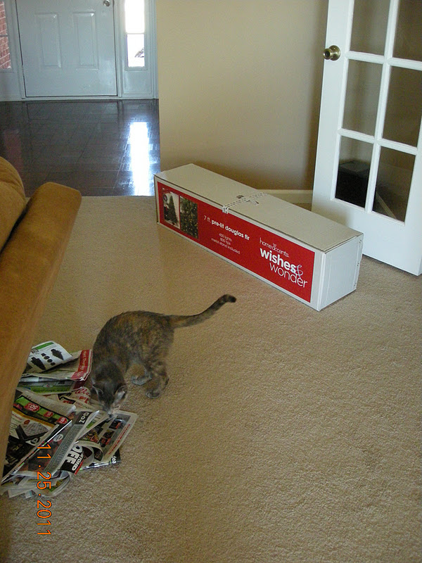 The kitties LOVE the Christmas tree…maybe a little too much. No matter how many times we straighten the tree skirt, it never stays in place because they are constantly attacking it. Same for the tree itself. We’ve found several ornaments on the floor so far (thankfully not broken!), and they also like to chew on the branches themselves. So far, they haven’t tried to climb the tree yet (that we know of), but I’m thinking it will be a miracle if it stays upright for the next month. We’ll see…