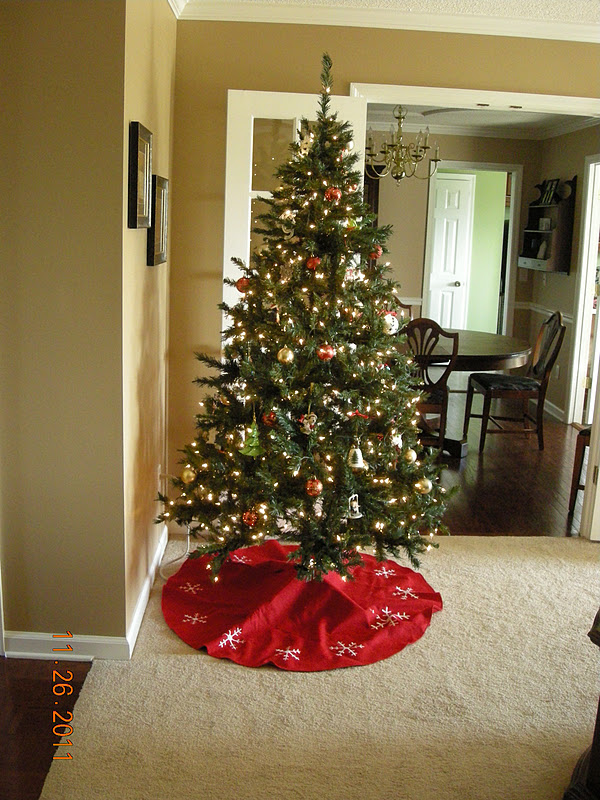We ended up getting a 7 foot pre-lit tree with clear lights, and it fits great in our living room. We’ve gotten it mostly decorated, but it still needs a big bow on top and maybe a few more ornaments. It’s getting there though!