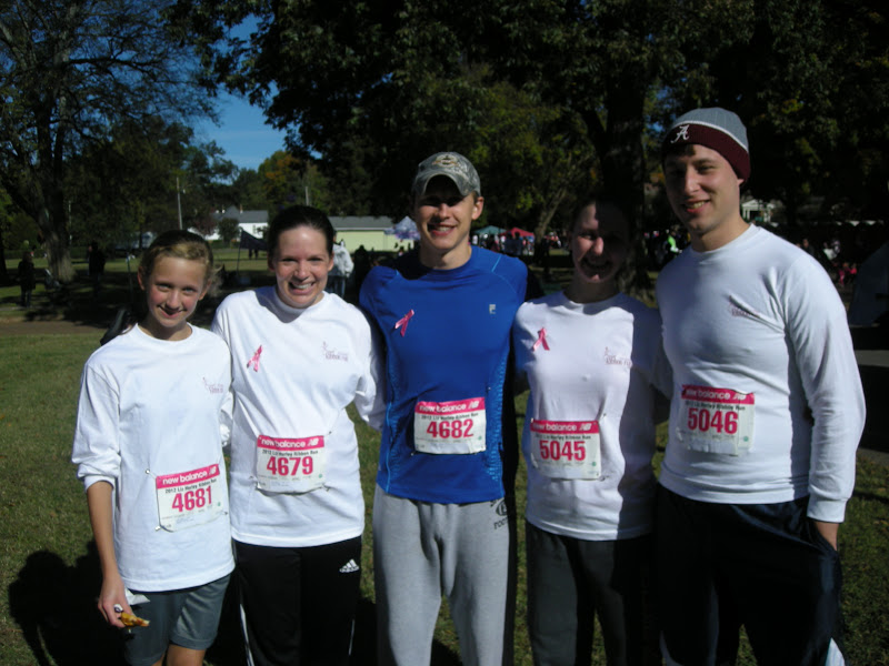Saturday was the Liz Hurley Ribbon Run, so Travis and I woke up early for it. He ran first and did great! His time was 22:16…he was really moving! I ran with Alisha and Melissa, and we were just a tad bit slower than that :) I did manage to jog the whole way without stopping, which I think was a pretty big accomplishment considering the extra load I’m toting! We had a lot of fun, and it was for a great cause…beating breast cancer!